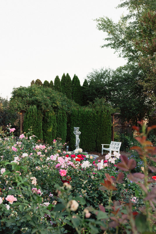 Our goal is to give you ideas and inspiration while strolling through the garden rooms of thousands of own-root roses, trees, shrubs, perennials, benches, trellises, arbors, fountains, and sculptures. Everywhere you walk, you will find sights to delight your senses. With four distinct seasons of intense heat, freezing cold, and blustering winds, the Display Garden provides an ideal environment to test roses and plants we offer in the Garden Center.